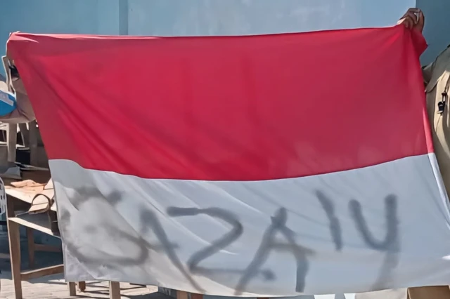 Aksi vandalisme tersebut berlanjut hingga ke bendera negara. Ketiganya menurunkan bendera Merah Putih di halaman sekolah, lalu mencoretnya dengan tulisan “GAZA14” menggunakan cat semprot hitam, sebelum kembali mengibarkannya.