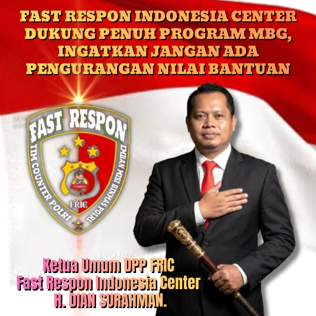 Jakarta,Suarabersama.com – Ketua Umum Dewan Pimpinan Pusat Fast Respon Indonesia Center (DPP – FRIC), H. Dian Surahman menyatakan dukungan penuh terhadap program MBG (Makan Bergizi Gratis) yang digagas oleh Pemerintah Republik Indonesia sebagai bagian dari upaya meningkatkan kualitas kesehatan dan kesejahteraan masyarakat, khususnya bagi generasi muda Indonesia.