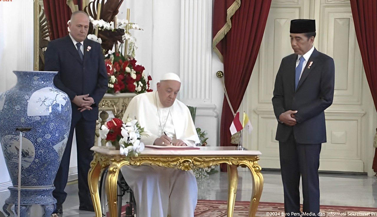 Paus menuliskan pesan yang menyentuh di buku tamu kehormatan. Dikutip dari unggahan akun Instagram resmi @vaticannews, Rabu (4/9), Paus Fransiskus menuliskan pesannya dalam bahasa Inggris saat menandatangani buku tamu tersebut. Dalam pesan tersebut, Paus menggambarkan Indonesia sebagai tanah perjumpaan antara berbagai budaya dan agama.
