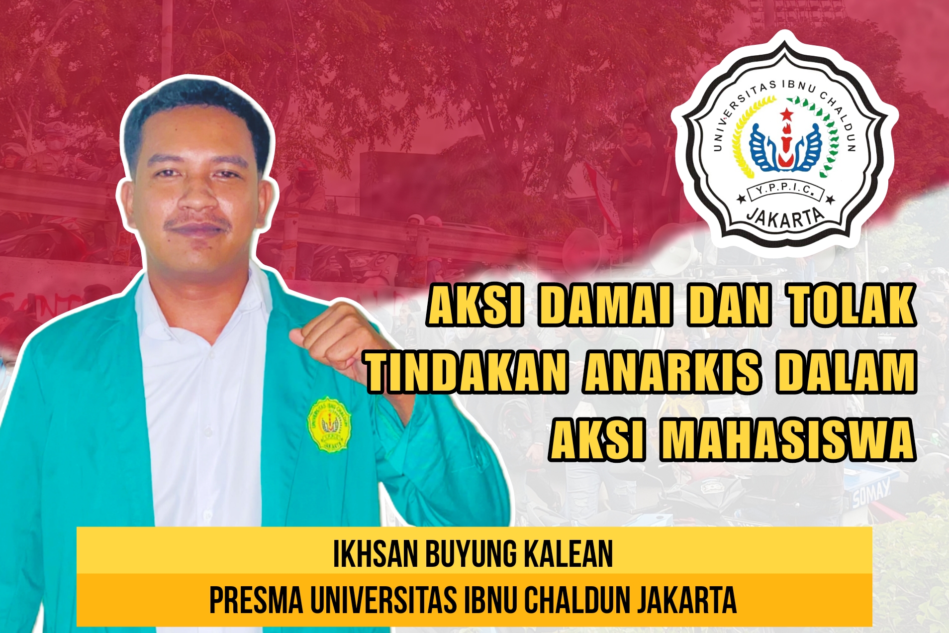 “Indonesia butuh ruang demokrasi yang sehat, bukan kerusuhan. Kami menyerukan kepada seluruh mahasiswa di tanah air untuk menjaga persatuan, merawat demokrasi, dan menolak segala bentuk provokasi anarkis,” tegas Ikhsan Buyung Kalean (Presma UIC Jakarta) dalam pernyataannya.